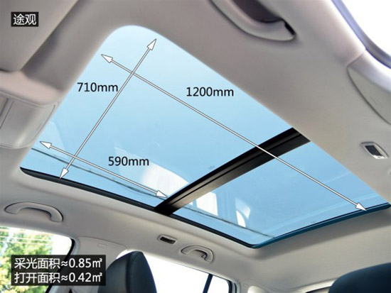 大众途观全景天窗尺寸如下图,长为1200mm,宽为710mm,整体面积约为0.85平方米,可开启部分为0.42平方米左右。天窗打开效果图如下;