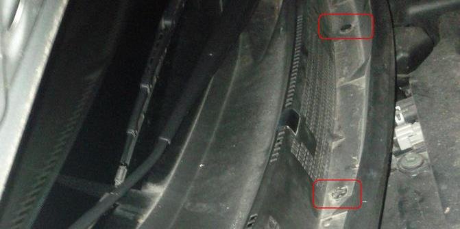 3、首先把去年自己装的空调滤芯拆下来,拆下来以后还要把那个白色盖子盖好,不然清洁剂会从缝隙处渗出来。拆开下图中红框位置的塑料卡套,一共有5颗,下图红框位置显示了其中三颗。