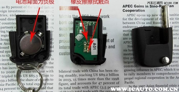第三步:用平口螺丝刀起出旧电池,放入新电池。注意:电池正极(+)一面朝下。再将电路板安装到位,再将钥匙盖对好位置,用手用力按下,会听到扣好的响声,扣好后看一下缝隙不要太大就完成了。