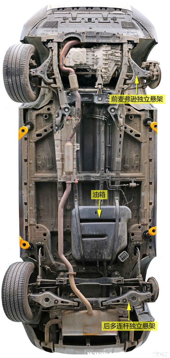 另外,为了提高底盘钢度,在底盘中部分别设计三条横向加强筋。上述部分的表现非常符合其SUV的身份。但在底盘隔热材料方面就稍显不足,虽然RX5选用铝箔材质,但隔热面积较小,仅约占排气管线长度的40%。而问题出在了底盘管线无防护上,且局部区域布局在底盘纵梁下方,面对意外的剐蹭存在一定的防护不周现象。