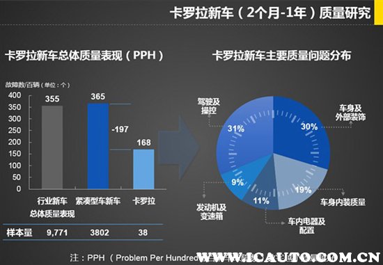 在紧凑型车新车质量表现调查中,丰田卡罗拉的总体质量表现最好,排名第一。其PPH值仅为168(样本量为38),与紧凑型车的整体表现相比少197,整体表现非常不错。值得注意的是由于一汽丰田在今年6月份推出了全新一代卡罗拉,因此新车的PPH值将包括目前在售的新一代卡罗拉和2016款卡罗拉。