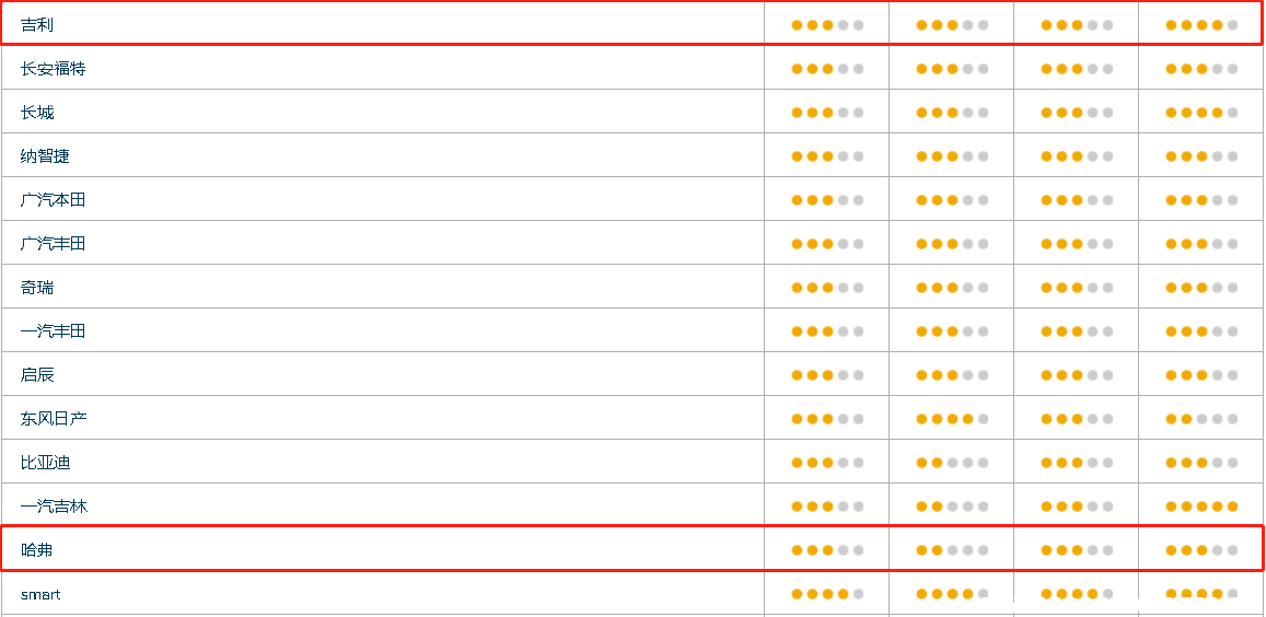 整体对比来看,哈弗和吉利基本持平,只有在动力及变速系统质量和零配件质量上哈弗是差于吉利的,不过差距不大。