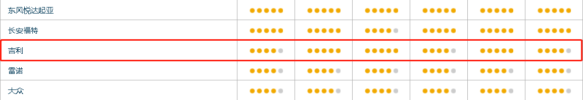 那我们来看看它调研的中国汽车可靠性研究报告(数据为2016年,已最新),调研关注的是新车车主在拥车首3-4年里遇到的问题。评分项目有四项,分别是整体质量、动力及变速系统质量、车身和内装质量(例如内饰异响、漏水和噪音等)和零配件质量(多媒体娱乐系统、雨刷器、空调等)。评分通过项目问题总数,然后使用点亮的圆点来显示,五个为最优等;四个为次优等;三个为平均水平;两个为其他。