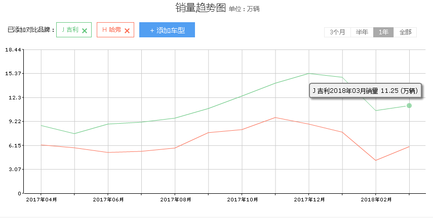 最后看一下最近一年里两家厂商的月销量表现。吉利在最近一年的表现还是令人满意的,销量不断增长,而哈弗在2016年年末月销量是曾经超越吉利的,不过这一表现没有坚持下来,如今月销量相比吉利还是有很大差距。