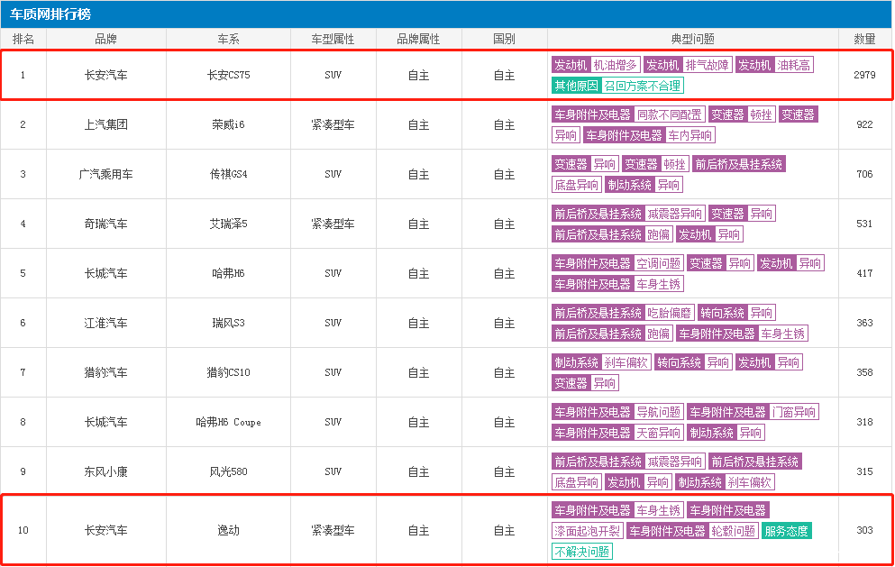 在车质网最近一年的投诉排名中,长安也有两款车型跻身前十,分别是长安cs75和长安逸动。