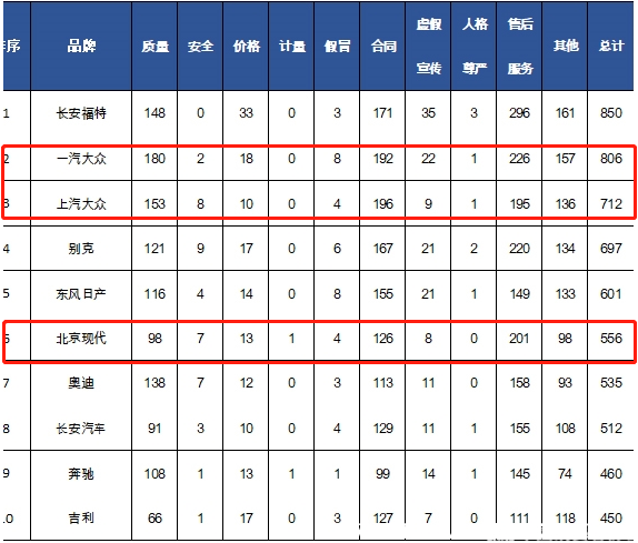 接着是中国消费者协会在今年3月份公布了2017年受理的汽车品牌投诉数据。北京现代、一汽大众和上汽大众都进入了前十中,质量投诉最严重的是一汽大众,其次是上汽大众,最后是北京现代。不过如果你认为大众的质量和现代质量有很大差距,那就未必了。要知道,大众如此多的投诉是建立在300多万辆的销量上,而现代的销量是大众的四分之一左右,如果计算销量投诉比的话,北京现代反而败下阵来。