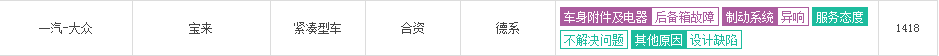 车质网提供了最近一年里合资品牌车型的投诉情况,我们从前30名进行统计,大众有宝来、朗逸、速腾、迈腾和高尔夫5款车型进入榜单;现代有朗动1款车型进入榜单。如果需要了解更多品牌车型的投诉,可以到车质网进行了解。以下是上面提到车型的典型问题。