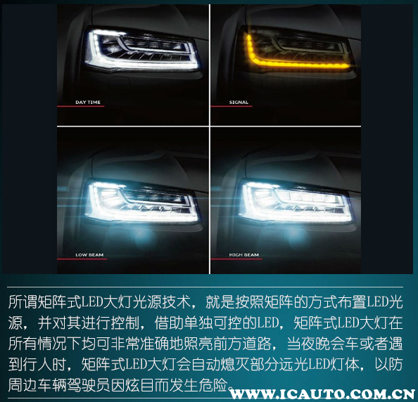 同年,奥迪推出了矩阵式LED大灯光源技术。有的人会问,为何要在汽车灯光上用那么多新技术?其实奥迪并不是将照明作为灯光的唯一用途,更重要的是一个设计元素,就好像现在沃尔沃的雷神之锤、宝马的天使眼、福特野马的阿迪达斯车灯等,都是一个品牌的象征。其次是车灯技术在道路行车安全方面有着不容置疑的意义。