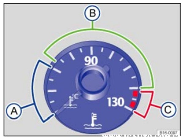 C警告温度区:在发动机负荷较大时(特别是在环境温度较高时),指针也可能大大向右偏转。