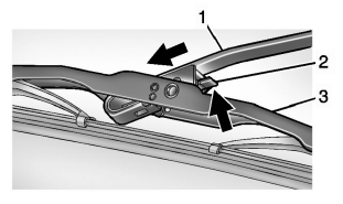 后窗刮水器刮片的更换:要拆下刮水器刮片: 1. 启动车辆并操作后窗刮水器。 2. 当扰流器不再遮盖后窗刮水器刮片时,将车辆熄火。 3. 将刮水器臂从车窗上提起。 4. 推动释放拉杆(2),分开挂钩并将刮水器臂(1)从刮水器刮片总成(3)中推出。 5. 将刮水器刮片总成牢固推入刮水器臂,直至释放拉杆卡入位。