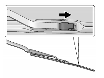 前刮水器刮片的更换: 1. 将挡风玻璃刮水器总成拉离挡风玻璃。 2. 抬起刮水器刮片中部连接刮水器臂的固定销。 3. 打开固定销,朝挡风玻璃向下拉动刮水器刮片将其从刮水器臂的J形固定端松开。 4. 取下刮水器刮片。 5. 以相反顺序执行步骤 1-3,进行刮水器刮片的更换。