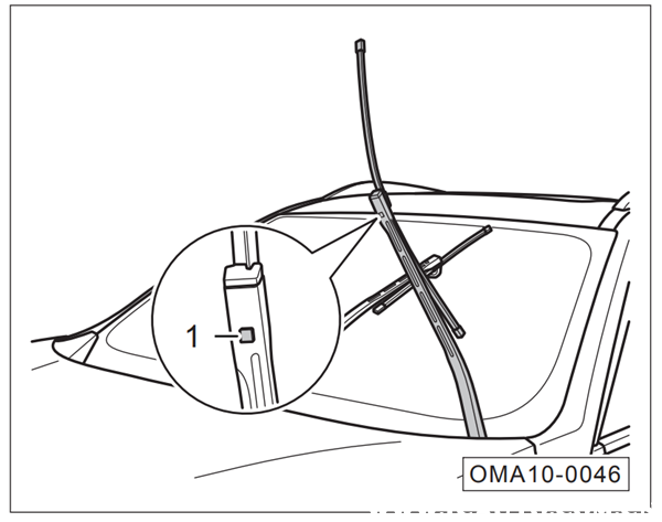 3.抬起雨刮臂,按压上图所示锁止按键“1”,并向上滑动雨刮片,即可将其拆下。
