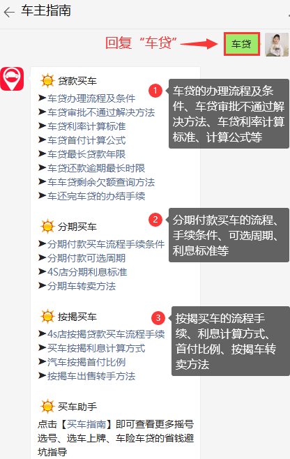 小编提醒:在微信公众号【车主手册】回复【车贷】,即可获取车贷的办理流程、办理条件、车贷审批不通过解决方法、车贷计算等;查看分期付款买车的流程、手续、条件、可选周期、利息标准等;获知按揭买车的流程/手续、利息计算、首付比例、按揭车转卖方式等。
