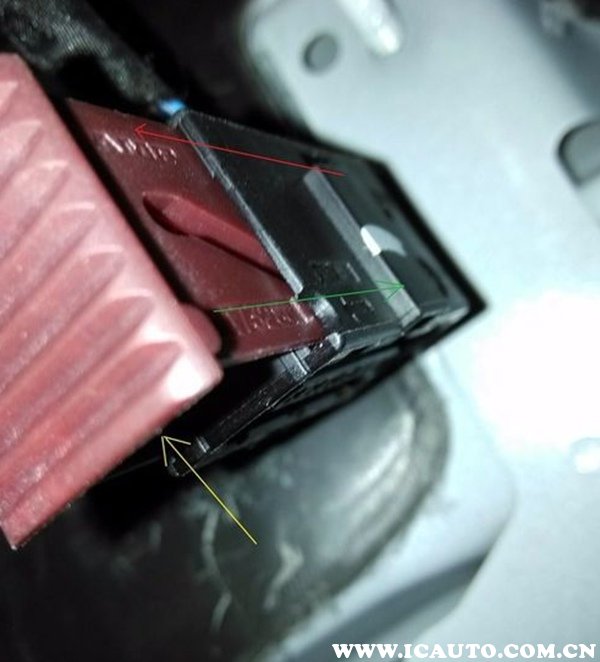 1、拆卸油门踏板插头,平口螺丝刀从黄色箭头位置插入,然后往红色箭头方向用力,这样插头就能轻松拆下。
