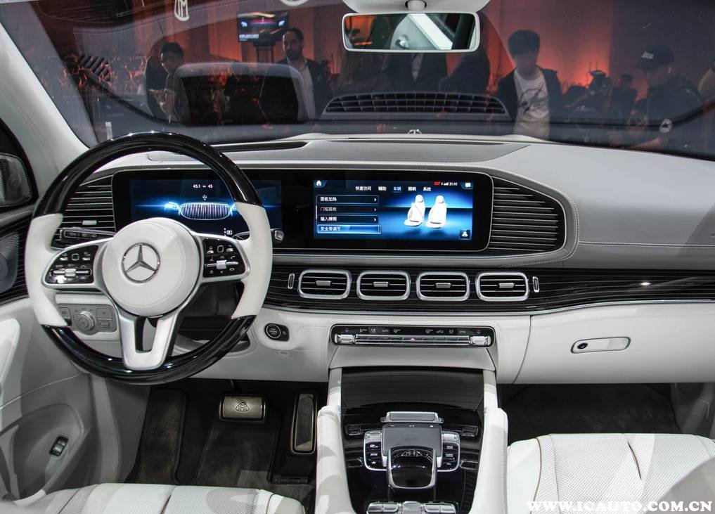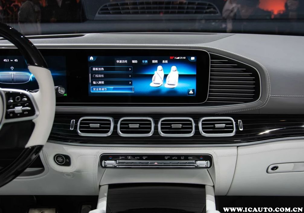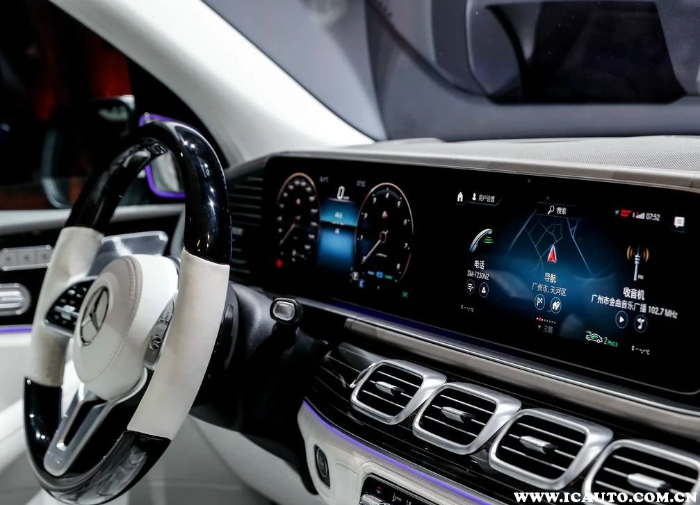 中央多媒体系统与仪表盘连成一体,凸显出科技感。显示屏和仪表盘的尺寸均为12.3英寸,通电以后仪表盘会显示一个迈巴赫GLS前脸的动态图像,仿佛车辆活过来一般。