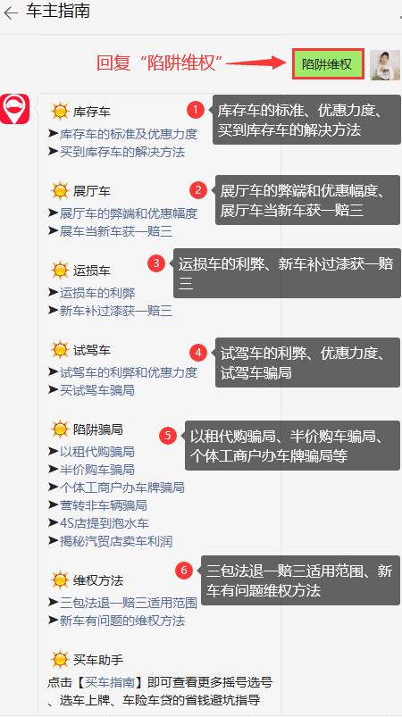 小编提醒:在微信公众号【车主手册】回复【陷阱维权】,即可获取库存车、展厅车、运损车、试驾车等车辆的相关内容;查看以租代购骗局、半价购车骗局、个体工商户办车牌骗局、营转非车辆骗局等;获知三包法退一赔三适用范围、新车有问题的维权方法等。