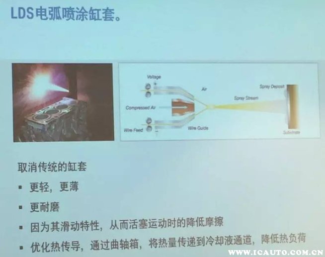 气缸内壁涂层:宝马的B系列发动机都是使用一体式的曲轴箱,而且气缸内壁并没有使用缸套而是使用LDS涂层。涂层通过电弧丝加热融化然后喷涂,厚度仅有0.3mm,但是具有极好的耐磨性和导热性。