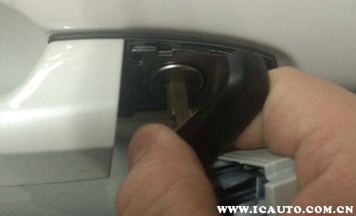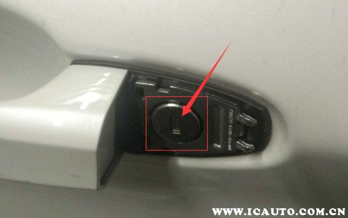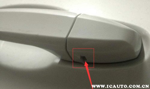 3、将汽车钥匙向上抬起,即可将门把手上的盖子拆下,可以看到隐藏的机械钥匙插孔位置。