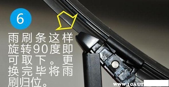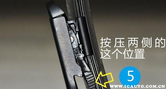 5、按下雨刮器中间卡扣两侧位置,然后旋转雨刮器就可以将其取下,接着更换新的雨刮器即可。