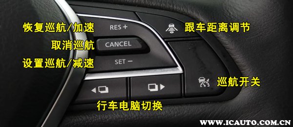 - 英菲尼迪QX50定速巡航按键使用图解 ①按下CANCEL即为取消定速巡航,然后按下RES可以恢复巡航。 ②SET键是设置巡航速度的,我们在开启巡航...[详细]