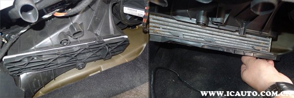 ②此时可以看到外部滤芯的真面目,将旧的空调滤芯取出,新滤芯按照指示方向安装。