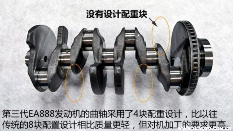 相比起EA113,EA888发动机的曲轴采用了4块配重,因此曲轴的质量就变小了。但是去掉配重会对曲轴的平衡造成一定影响,这就要求使用更加高的曲轴加工技术。