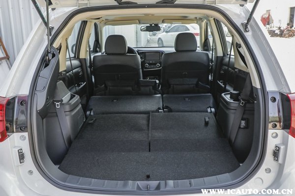 欧蓝德配备后电动行李箱,可以通过遥控钥匙开启。后排座椅支持4/6放倒,放倒后处于全平状态,空间布局也非常合理,没有多余的凸出,最大纵深1710mm,宽度1010mm,高度800mm,实用性一流。