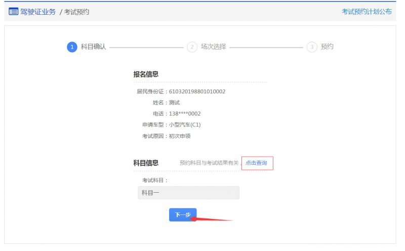 1、登录互联网交通安全综合服务管理平台,点击本地考试预约或异地考试预约,页面会显示学员的基本信息,需要选择预约科目,然后点击下一步。