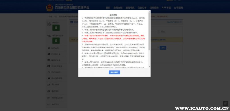 2、阅读考试预约业务须知,在阅读完毕后,点击阅读并同意。(仅在第一次考试预约时会显示。)