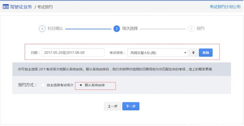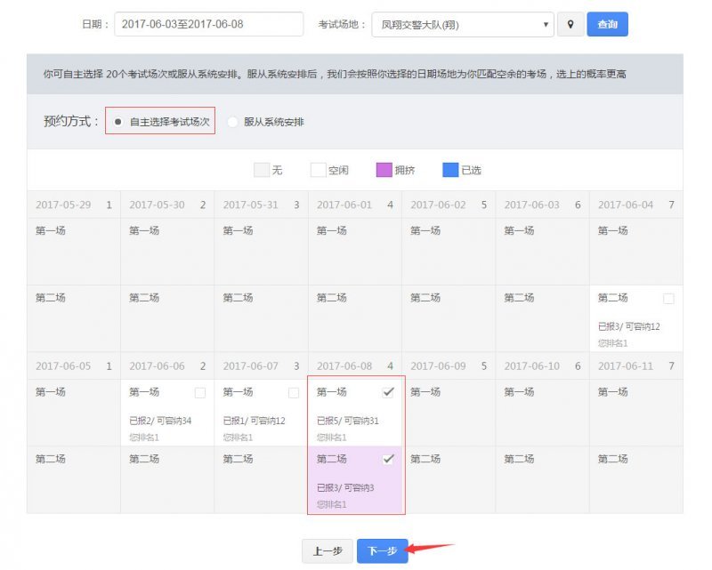 4、如果选择服从系统安排考试的模式,系统会根据选中的预约申请起止时间段内的自动匹配符合条件的考试场次,然后点击下一步。