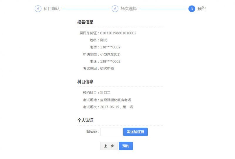 5、最后页面显示用户的预约信息,再次确认信息以后,点击发送验证码,系统会发送6位验证码到绑定的手机,输入手机验证码后,点击预约即可完成考试预约。