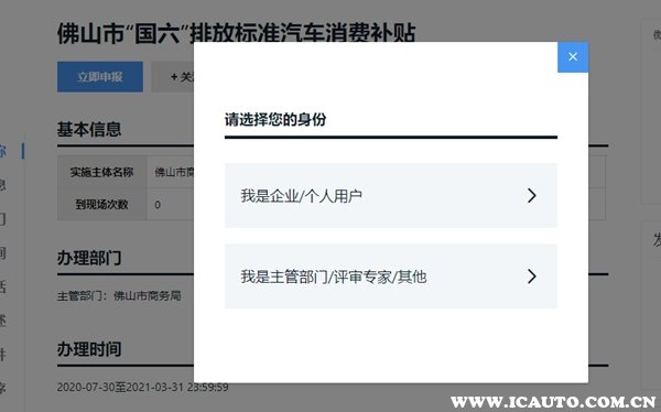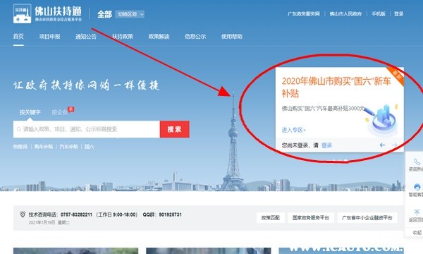 1、进入“佛山扶持通”官网,在登陆个人账号后点击右方的【2020年佛山市购买“国六”新车补贴】;
