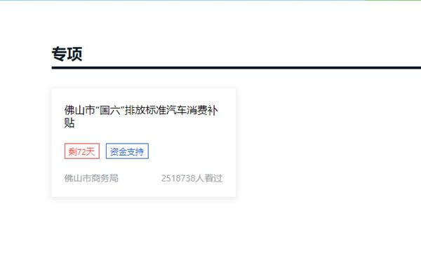 2、点击【专项】中的【佛山市“国六”排放标准汽车消费补贴】;