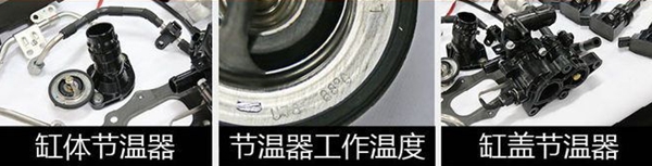 在汽缸盖和汽缸体上分别设计了一个节温器,由于二者工作温度不同,使得汽缸盖和汽缸体出的冷却水有着不同的温度。相比于只有一个节温器的发动机,这样的设计可以让汽缸体的冷却水温度更高,以降低缸体摩擦,达到节油的效果。
