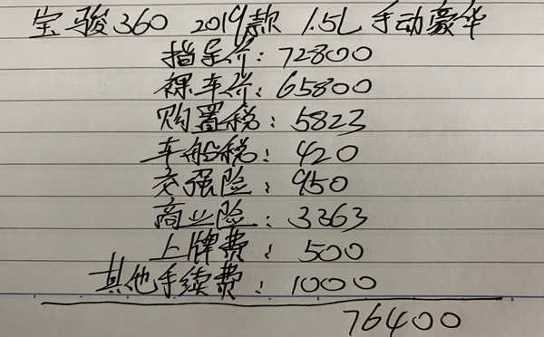 宝骏360 2019款 1.5L 手动豪华版作为宝骏360的中配车型,官方指导价7.28万,目前广州最高有7,000元的现金优惠活动,也就相当于这款360的裸车价是6.58万,全款购车包括车辆购置税、交强险、车船税、商业险、上牌费以及其它手续费,最后这款宝骏360中配落地7.64万。