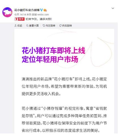 在今年3月,花小猪在部分城市开启测试运营,7月官方正式宣布上线。不管是品牌名称,还是上线后打出“花小猪打车,打车可以更便宜”的口号,都表明花小猪打车定位是亲民、实惠、年轻用户。