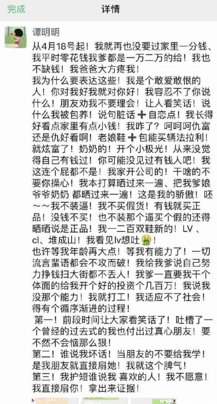 而谭明明本人作为一名富二代,刚刚从一所职业学院毕业,没有固定职业,平时生活奢靡,经常在社交媒体上炫耀,还晒出了其父母对她非常溺爱。