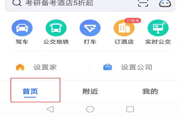 2、进入到主界面后,可以看到左下角几个选项,分别是首页、附近、我的,这里我们需要点击首页。
