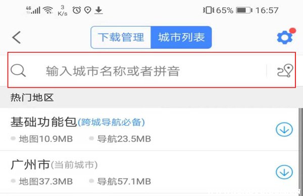5、在界面的最上方可以看到下载管理、城市列表,下方有基础功能包,需要点击下载。