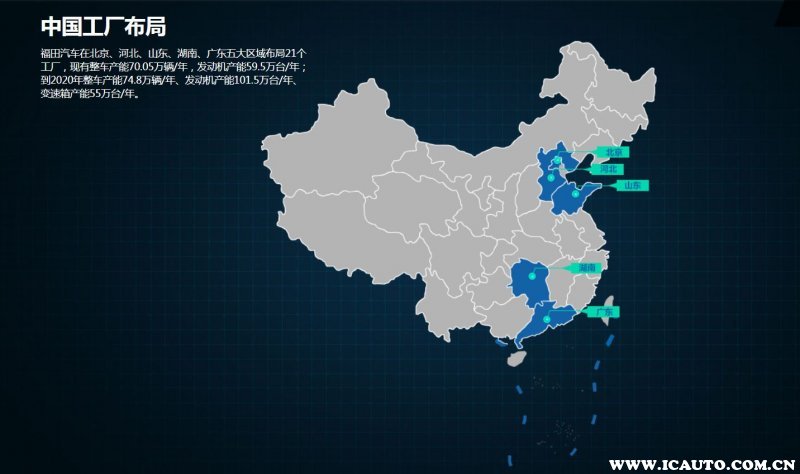 福田汽车在北京、河北、山东、湖南、广东五大区域布局21个工厂,现有整车产能70.05万辆/年,发动机产能59.5万台/年;到2020年整车产能74.8万辆/年、发动机产能101.5万台/年、变速箱产能55万台/年。