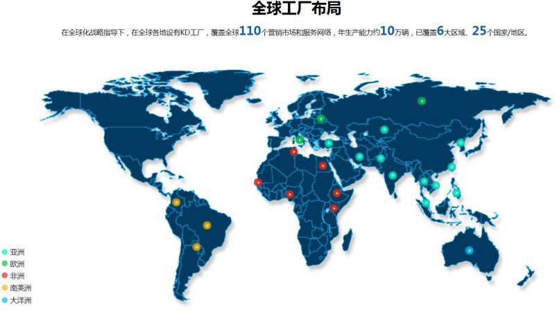 而在全球范围内,福田汽车在亚洲、欧洲、非洲、南美洲、大洋洲建立了一共110个营销市场和服务网络,年生产能力约10万辆,已覆盖6大区域、25个国家/地区。