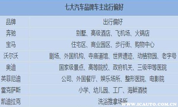 高德地图曾经发布了一篇分析报告,在这个报告里面显示,奔驰车主最喜欢去的地方是别墅、火锅店、飞机场;宝马车主喜欢去步行街;沃尔沃车主喜欢去外国机构、植物园、博物院、寺庙道馆;凯迪拉克则喜欢去推拿足浴场所。