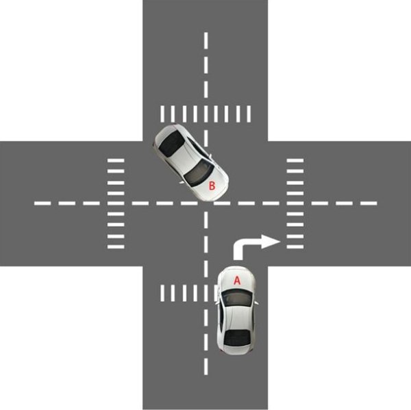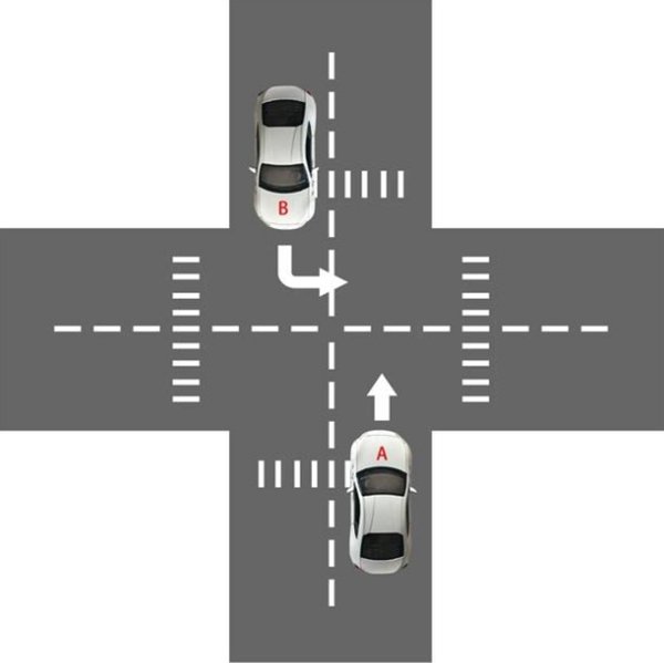 图中可以看到,A车准备右转,而B车在此时迎面而来需要左转,这种情况A车就需要让B车先行了。