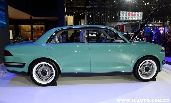 从车展的实拍图中可以看到,潮派的外观采用了复古的设计风格,前脸封闭式中网设计,搭配上两个外挂式圆形灯组极具辨识度。车身侧面由一条笔直的腰线贯穿前后,门把手采用了隐藏式设计,给人一种简洁大方的视觉感受。车尾采用了双C型贯穿式尾灯设计,整体方方正正,非常大气。