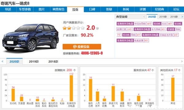 从第三方汽车故障投诉平台车质网中可以看到,2020款奇瑞瑞虎8的故障投诉量共有208个,其中典型故障主要有中控台异响、发动机抖动、故障灯亮、车内异响、变速箱异响、漆面开裂等,由此可见瑞虎8在质量方面还有较大的提升空间。