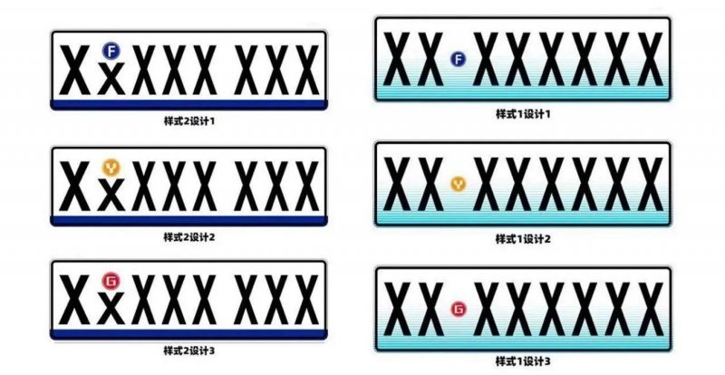 第一组小型汽车号牌采用白底黑字,最下方有一条蓝色横粗线;第二组小型汽车号牌也是白底黑字,不过车牌下半部分采用多条淡蓝细横线渐变设计。两组新型车牌还有一些共同点,就是采用了不同颜色的徽标设计,车牌序列代号由5位增加至6位。