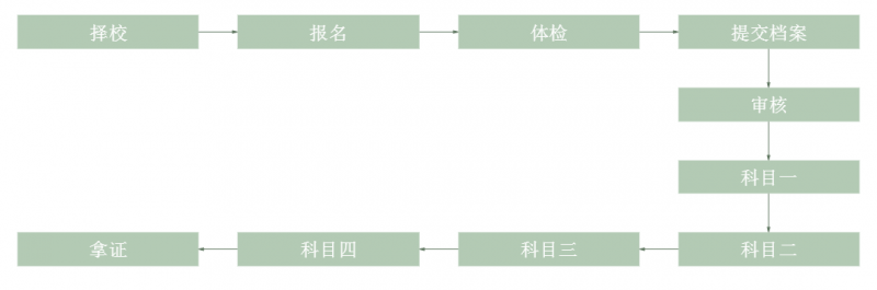 比起以往,如今是学车流程步骤还是蛮简单的,整体是可以分为十个步骤。虽然看着很多,但整体上难的也就科目二、科目三,具体如下图: