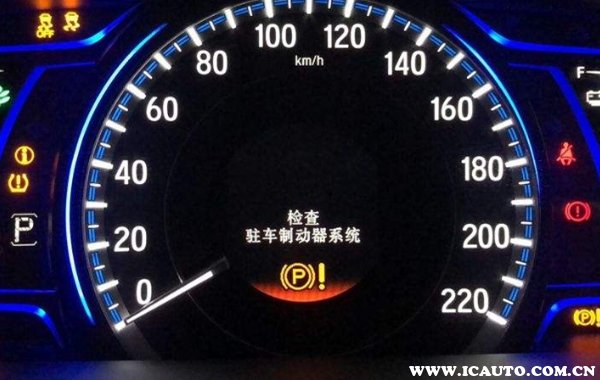 3、仪表盘上的p:代表的是驻车制动器指示标志,说明驻车制动器正在使用中,p图案是在指示灯的中间,有个圆包括,并且圆的两边还有括号包围。