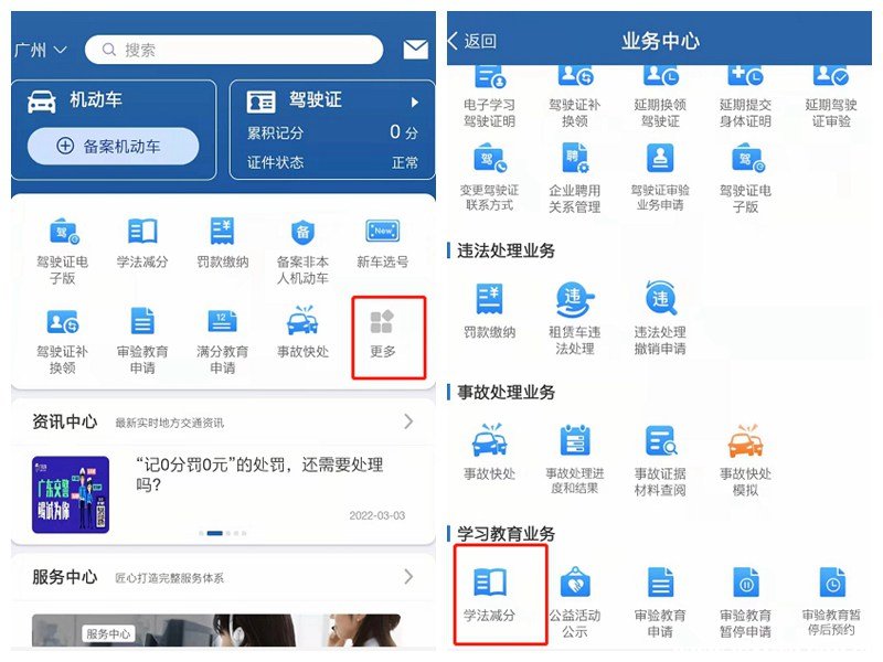 1、打开交管12123,进入主页后点击“更多”,下拉页面找到《学习教育业务》,并找到“学法减分”功能;