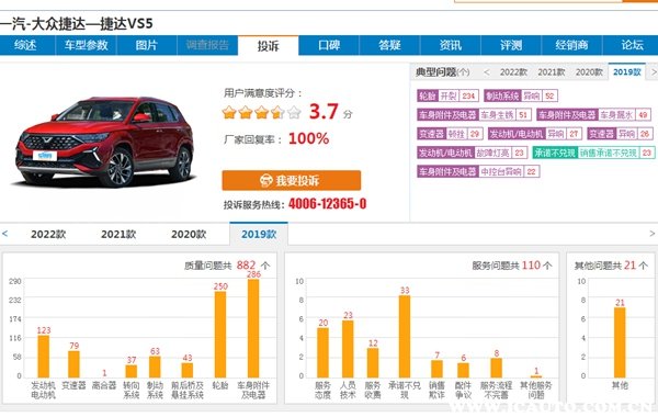 以2019款捷达VS5为例,3年间共收到882个车主投诉的质量问题,主要故障情况为轮胎开裂233例、制动系统异响52例以及车身生锈51例等等。用户满意度评分5分满分制,捷达VS5分值为3.7分。总体上,捷达VS5质量属于中规中矩,处于行业同级车型主流水平。这部分信息以及数据均参考车质网平台。